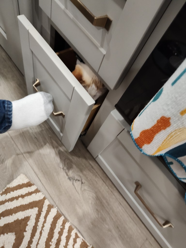 Ghost was checking things out smelling everything and found a bottom draw in the kitchen open. So he crawled in. He didn’t expect his weight to close it. So funny. He was tired so he decided to take a nap.