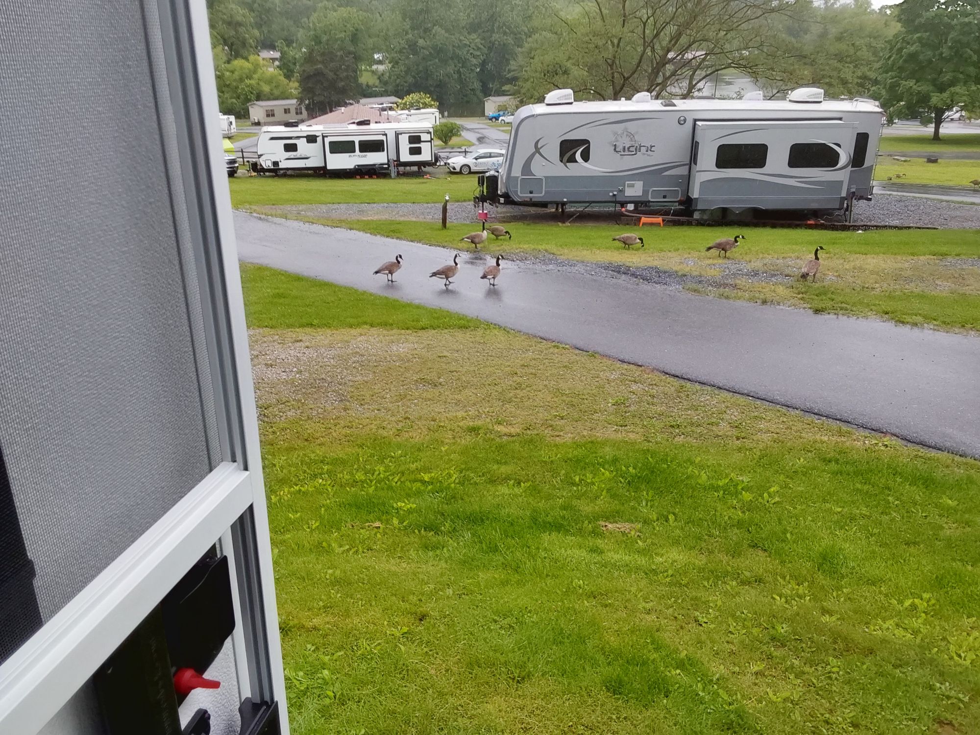 They have geese that live here in quantity. We saw them when we looked out the windows. There is always a master at each end watching the surroundings like a cop. The others are busy eating. They are fun to watch.