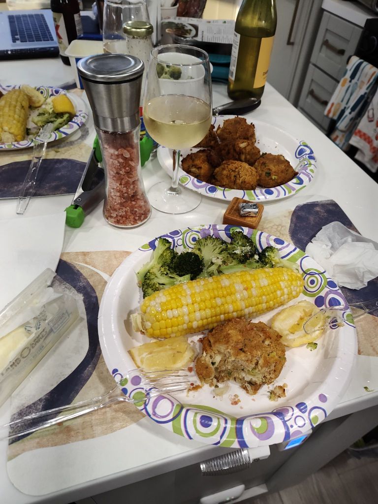 So dinner was crab cakes corn on cob and fresh broccoli.