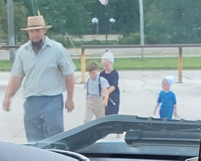 They park their wagons with the horses to posts set up in the parking lot. Then the dresses every female wears are plan cotton. They wear these white hats too. The kids are soooo cute. The boys sometimes wear suspenders.